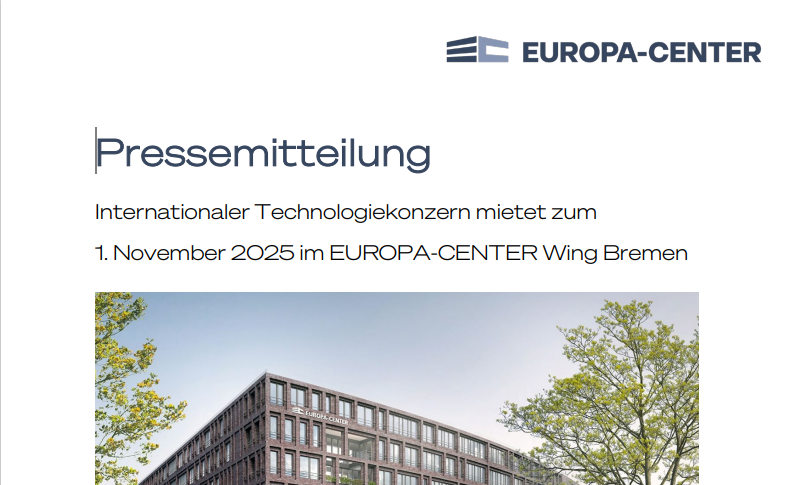 “The decision of a globally leading technology company to locate here is a strong signal for the appeal of both the EUROPA-CENTER Wing and Bremen’s Airport City as a whole,” emphasizes Ralf-Jörg Kadenbach, CEO of EUROPA-CENTER AG. “Such agreements underscore our position as a reliable partner for high-quality office properties and demonstrate that our integrated approach—from development and leasing to operations—meets the needs of modern companies that value quality, security, and long-term partnerships.”