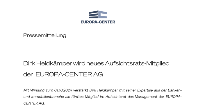 Con efecto a partir del 01.10.2024, Dirk Heidkämper, con su experiencia en el sector bancario y inmobiliario, refuerza la gestión de EUROPA-CENTER AG como quinto miembro del Consejo de Administración.